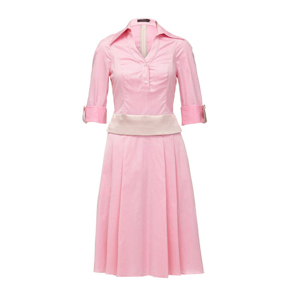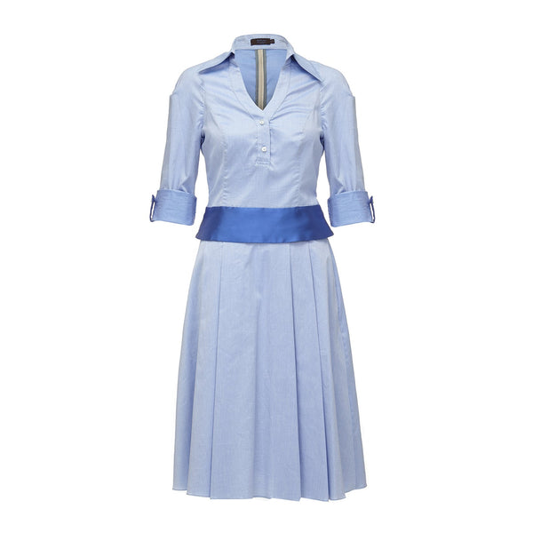 The Eucalyptus 3-in-1 cotton shirt dress with an open collar has 3/4 sleeves that can be rolled up and fastened by the sleeve band and a wide waistband that features a flatteringly cinched-waist look. A signature Deploy multi-functional design, it can be worn as a flared dress, a shirt, or a pleated full skirt as styled.