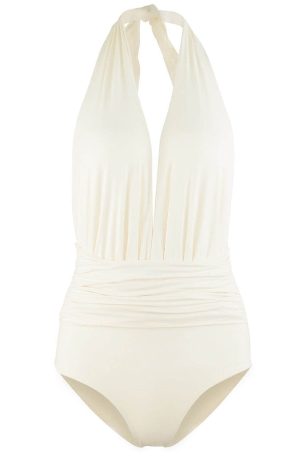 Meet the Eva one piece, one of our most popular swimsuits. Her deep plunge neckline and soft, elegant pleats set the stage for an extremely flattering waistline