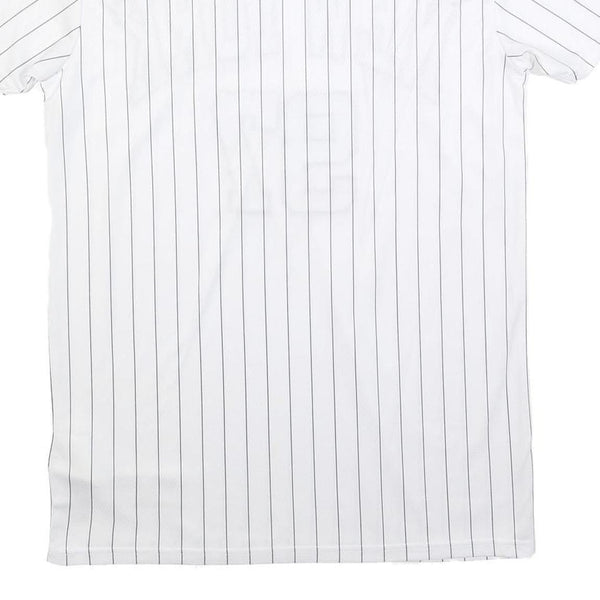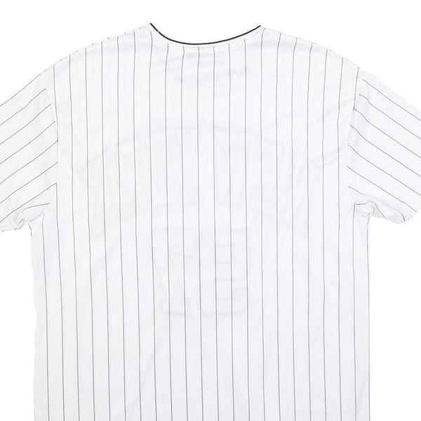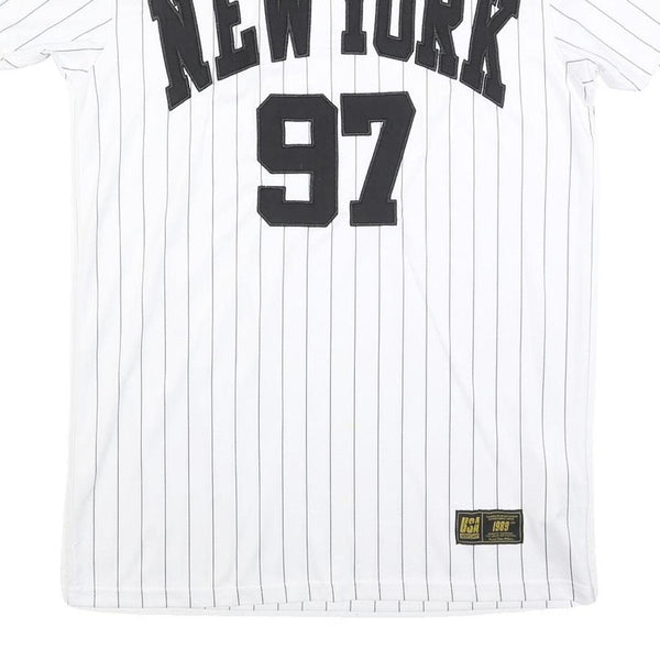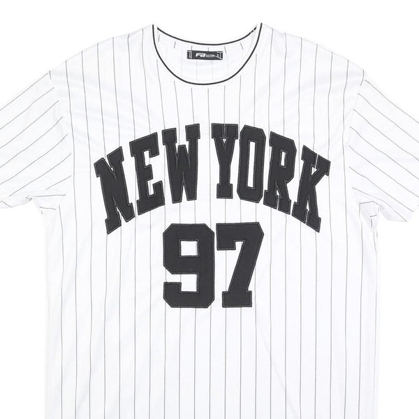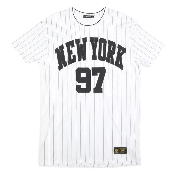 This FB SISTER Mens T-Shirt features a striking white base with thin black vertical pinstripes. Prominently displayed on the front is the text "NEW YORK" arched above the large number "97" in bold black applique, adding a sporty and urban edge to the design. A small branded patch is located near the hem, enhancing its authentic streetwear appeal.