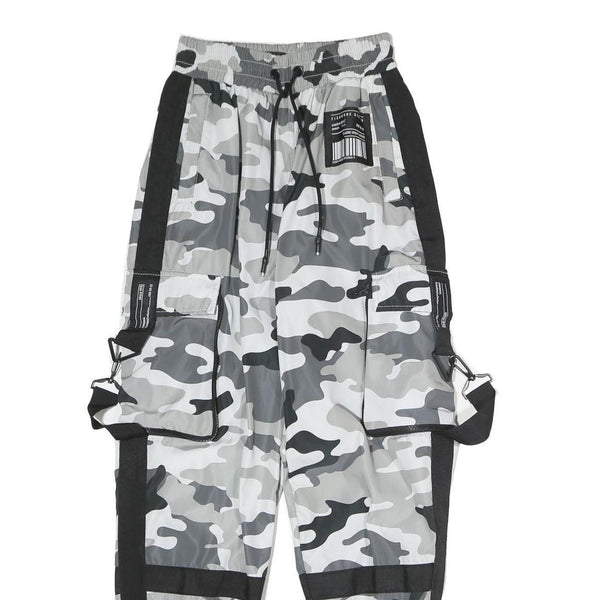 These FB SISTERS womens trousers feature a striking grey and black camouflage print with black panel detailing along the sides and legs. They have an elasticated waistband with a drawstring for an adjustable fit. The trousers also include multiple functional pockets, including zip and flap closures, adding a utilitarian cargo style. Ribbed cuffs complete the tapered leg silhouette.