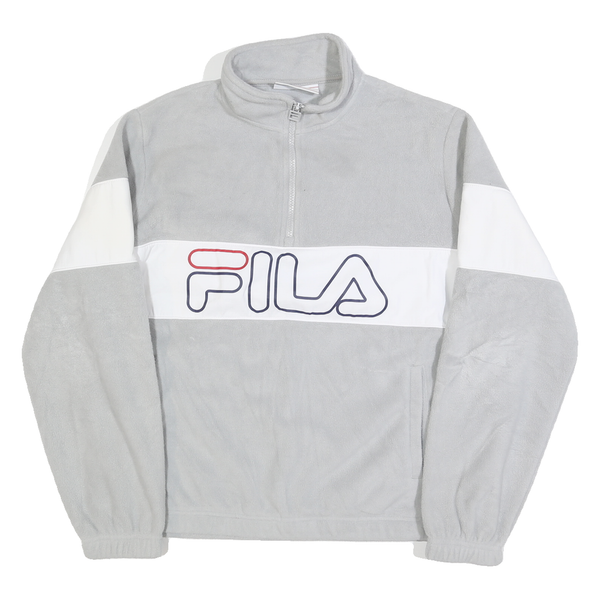 This FILA womens jumper features a soft grey polyester construction with a prominent white horizontal panel across the chest and upper arms. The panel displays the FILA logo in outlined red and navy letters, adding a sporty aesthetic. It has a 1/4 zip neckline with a stand-up collar and elasticated cuffs for a snug fit.