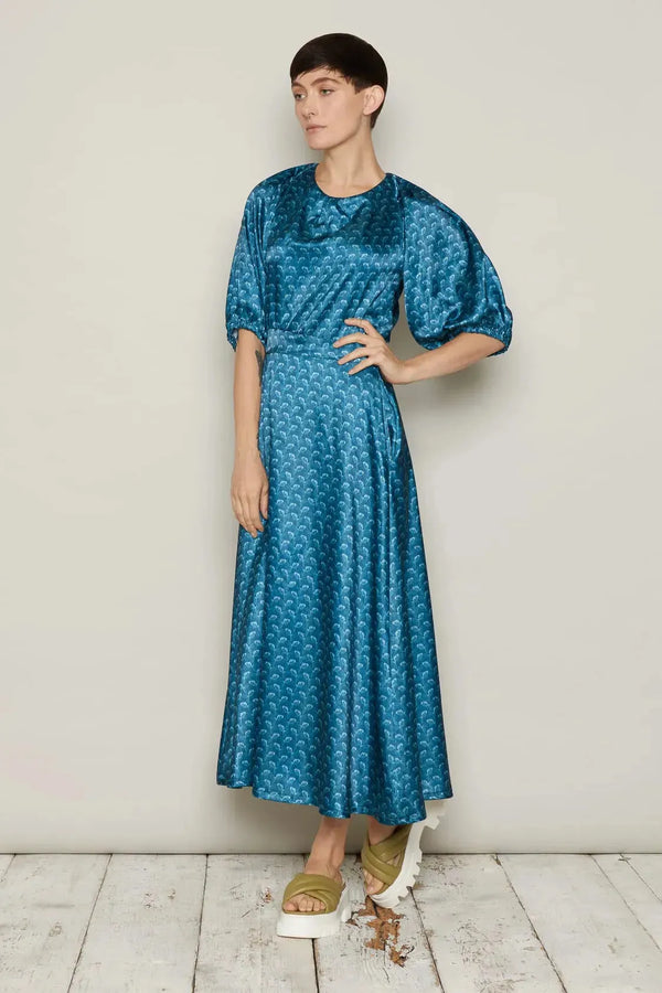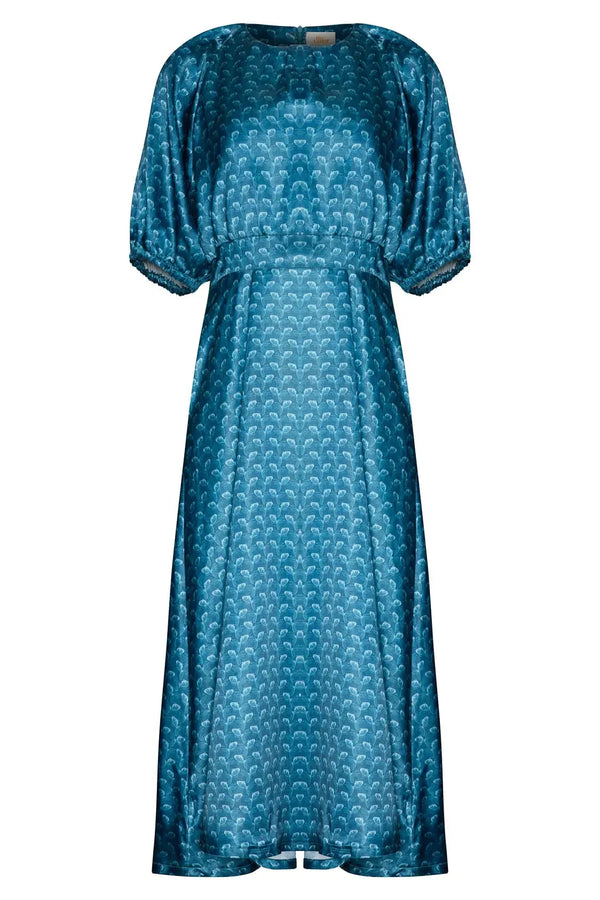 An iridescent satin feel with balloon sleeves to the elbow, the Flosi cinches at the waist before the full skirt beautifully drapes to the ankle. The Flosi dress is designed with pockets, enhancing its flattering cut