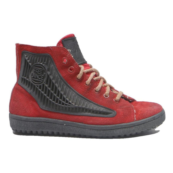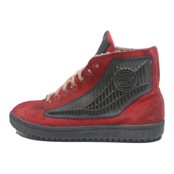 These FREE LANCE womens high top trainers showcase a striking combination of red suede leather and contrasting black rubber detailing. The shoes feature a lace-up front with beige laces and distinctive textured black side panels embossed with the FREE LANCE logo.