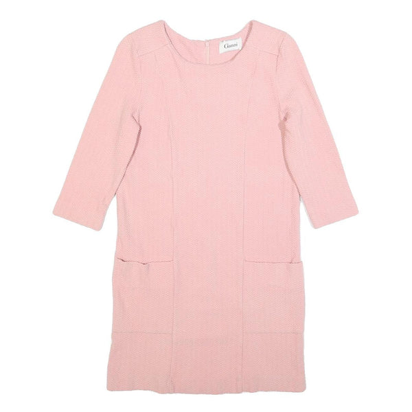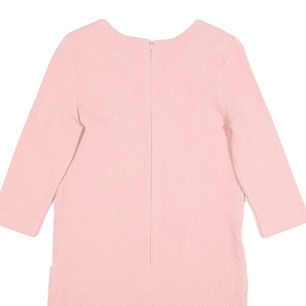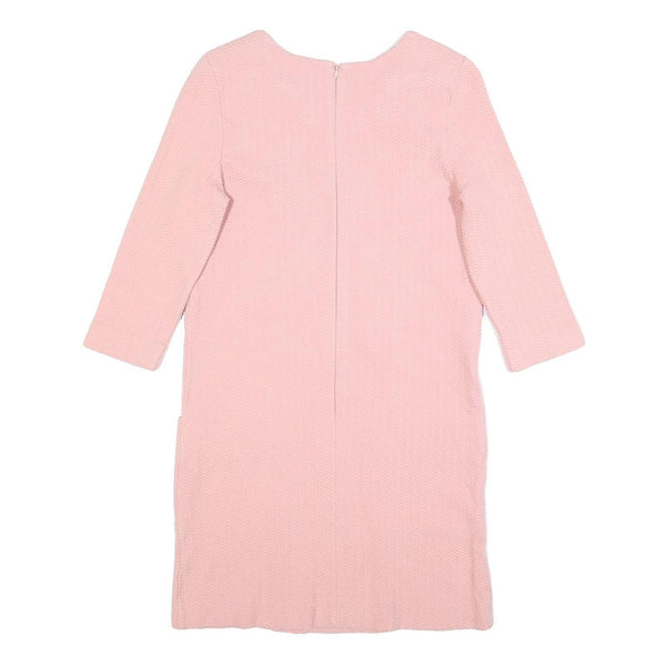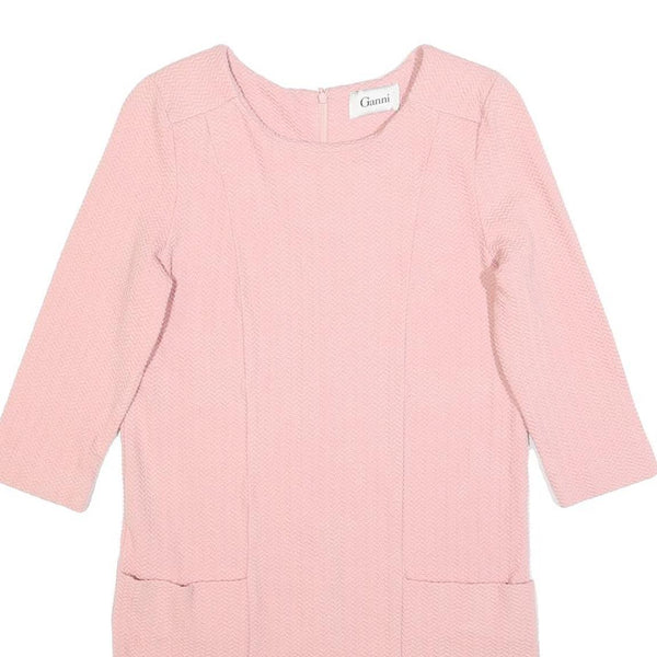 This GANNI womens dress features a soft pink hue with a subtle textured pattern throughout the fabric. The fit and flare silhouette offers a flattering shape, enhanced by the short sleeves and knee-length cut. The round neckline and back zip closure add to its classic design, creating a versatile and chic look suitable for various occasions.