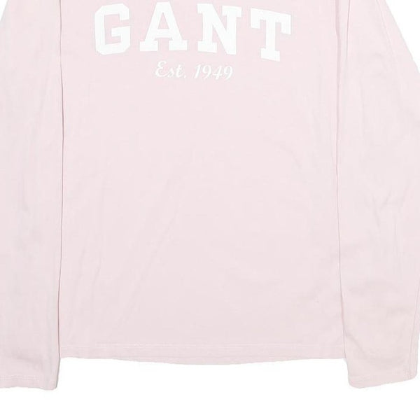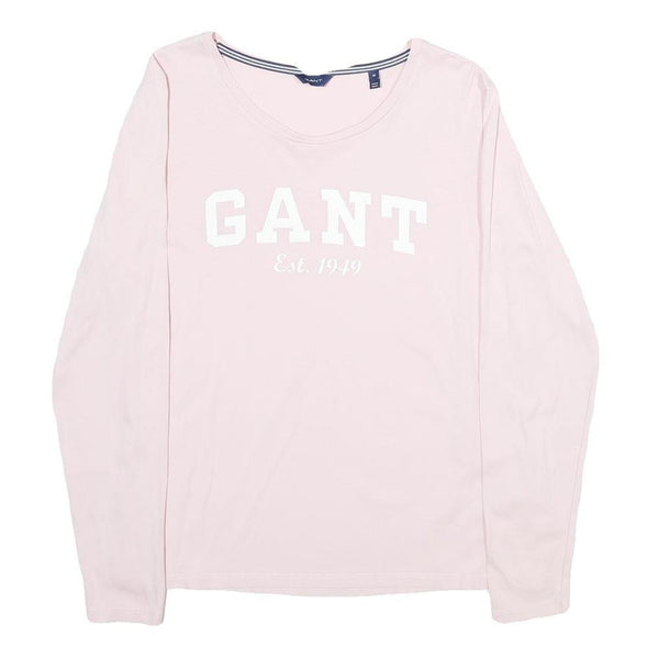 This Womens GANT T-shirt features a soft pink hue with a bold white 'GANT Est. 1949' logo printed prominently across the chest. The long sleeves and crew neckline create a classic, timeless look suitable for everyday wear.