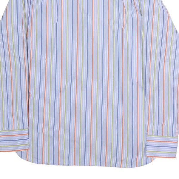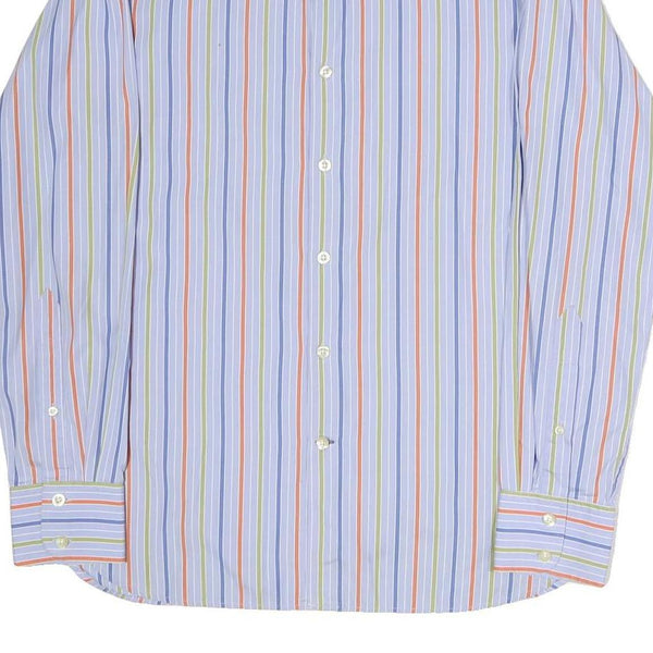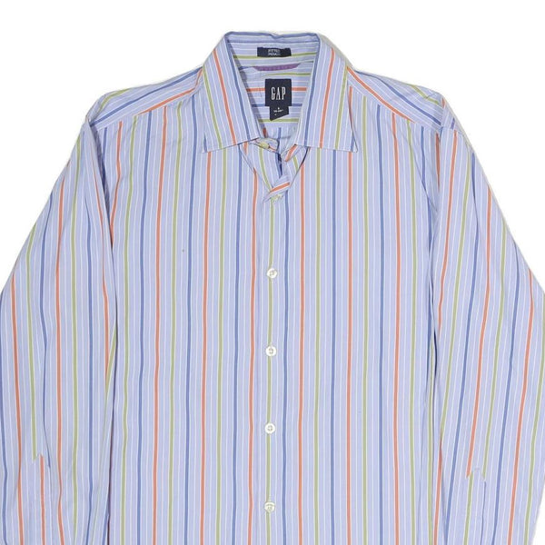 This GAP mens shirt features a classic striped pattern in blue, green, orange, and white hues. The stripes are regularly spaced vertically, giving the shirt a vibrant yet refined appearance suited for both casual and smart occasions.