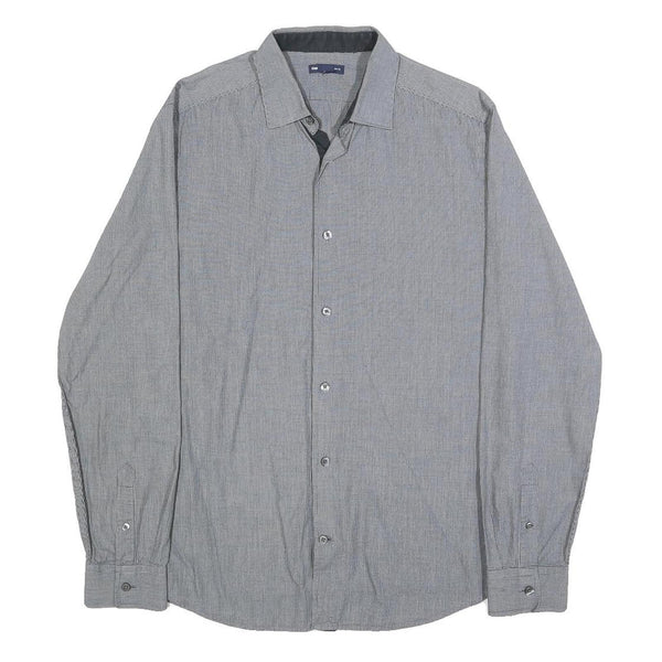 This GAP mens shirt showcases a subtle grey micro-check pattern with a classic pointed collar and long sleeves, perfect for both formal and casual wear. The fabric appears soft and breathable, made from 100% cotton ensuring comfort throughout the day. It features a traditional button-down front closure and buttoned cuffs, completing the timeless shirt design.