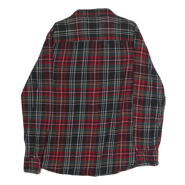 This GAP womens shirt features a classic check pattern in rich red, green, black, and white, creating a vibrant yet timeless look. The visible GAP brand label confirms its origin. It has a button-down front and a pointed collar, finished with long sleeves that end in buttoned cuffs for adjustable fit.