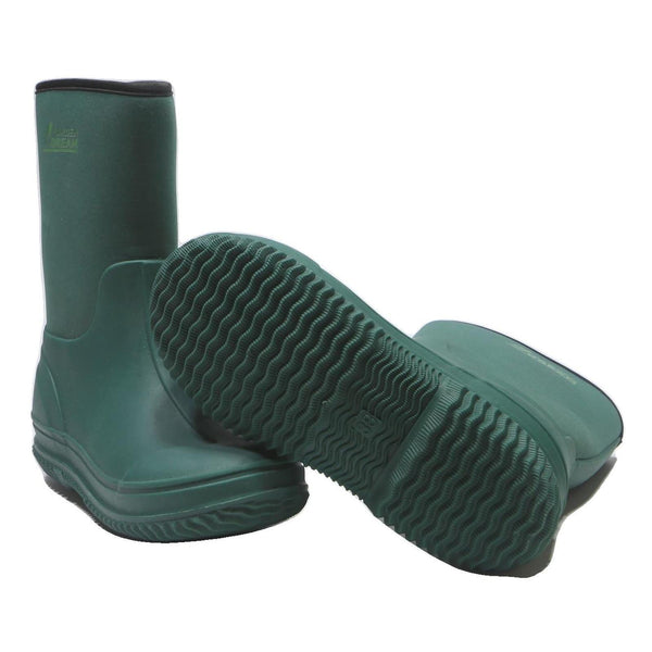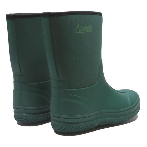 These Garden Dream boots feature a deep green colour with a subtle embossed brand logo on the upper shaft. The design is practical and simple, crafted from synthetic materials that offer waterproof protection ideal for outdoor use. The boots have a utilitarian ankle height that provides ample coverage while remaining easy to wear and move in.