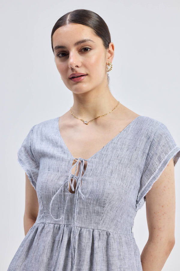 Here’s your dreamy, flowy maxi dress in linen stripes, designed with delicate tiers and a charming front tie for that extra touch of elegance. The frayed sleeves add character, while the comfy elasticated back ensures a perfect fit. Dress it up stylishly and effortlessly for casual outings or semi-formal occasions alike!