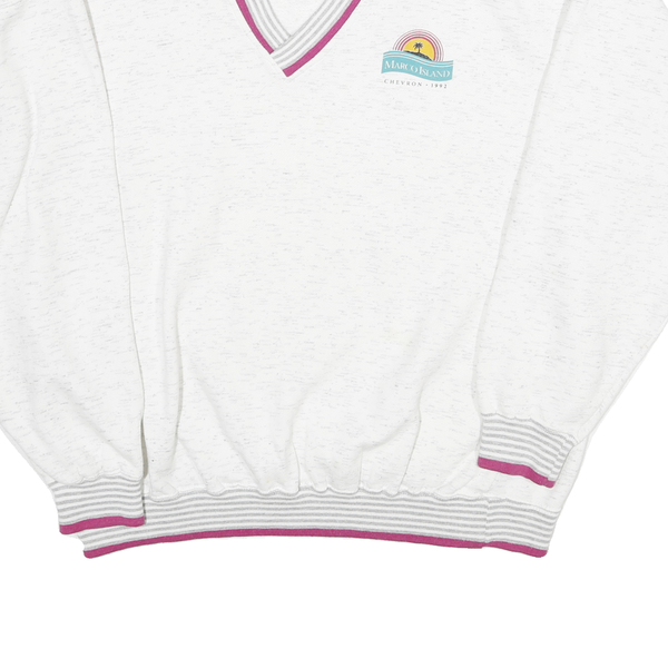 This men's sweatshirt by GEAR features a primarily white fabric with fine grey flecks throughout, giving it a textured appearance. The V-neck collar, cuffs, and waistband are ribbed with a striped pattern in grey and accented by striking deep pink edges, adding a retro sporty vibe. On the left chest area, a small colourful graphic print depicts a stylized sunset or sunrise with a palm tree and the text "Marco Island Chevron 1992" below.