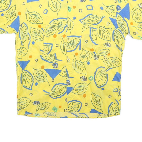 This shirt from Generra Collection features a vibrant yellow base with bold blue geometric shapes and leaf motifs, accented by small orange and green details. It showcases a button-down front and a classic point collar, creating a relaxed summer-ready look.