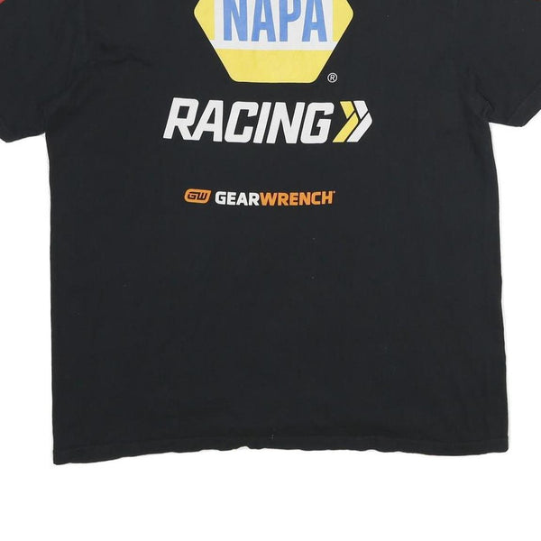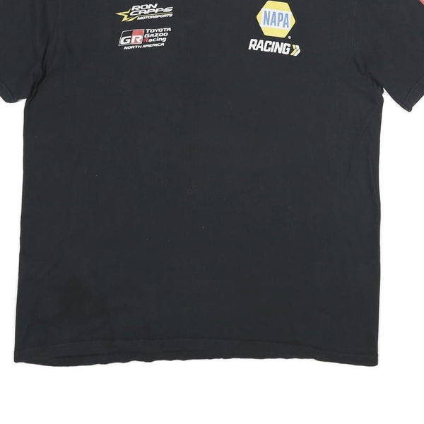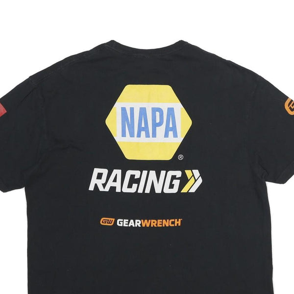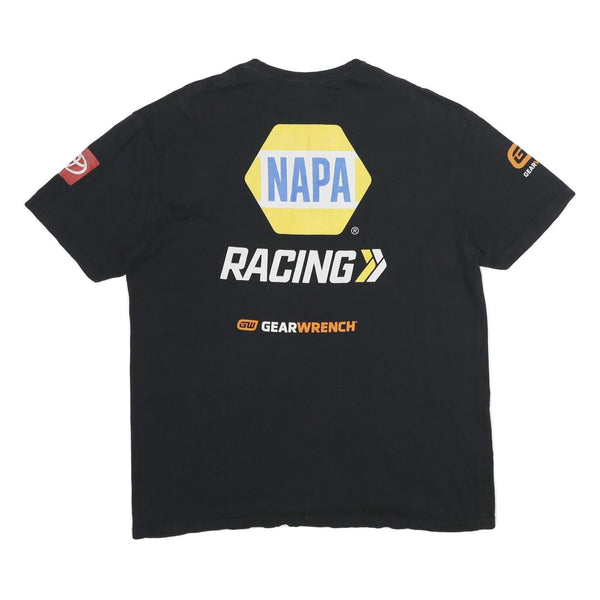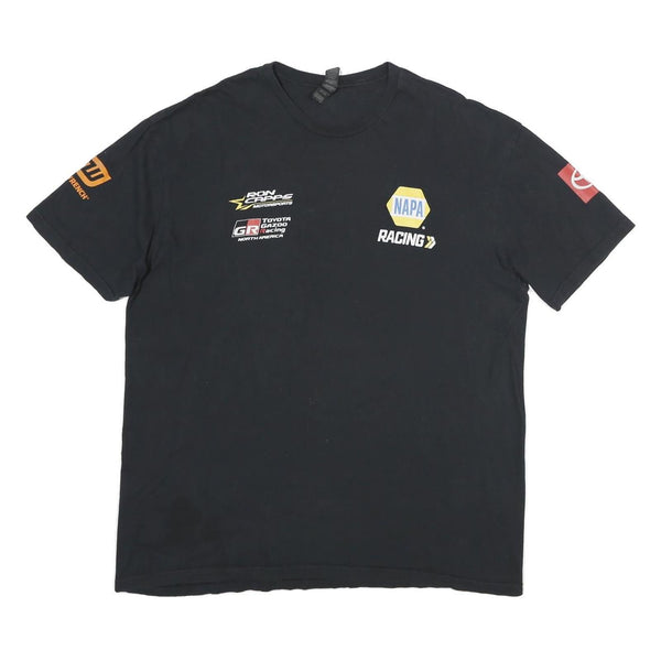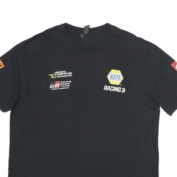 This black GILDAN Mens T-Shirt features multiple racing-related logos including NAPA, Ron Capps Motorsports, Toyota Gazoo Racing North America, and GearWrench printed on the front, back, and sleeves. The prominent NAPA Racing logo in yellow and blue on the back and front adds a motorsport vibe to the casual piece.
