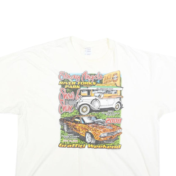 This GILDAN Mens T-Shirt is crafted from a cotton blend with a comfortable, relaxed fit, designed for everyday wear. The primary colour is white, highlighted with a striking detailed graphic print on the front. The print features vintage cars, stylised text promoting "Stray Angels River Forks Park Show & Shine 2008 Graffiti Weekend," and additional event details in vibrant colours.