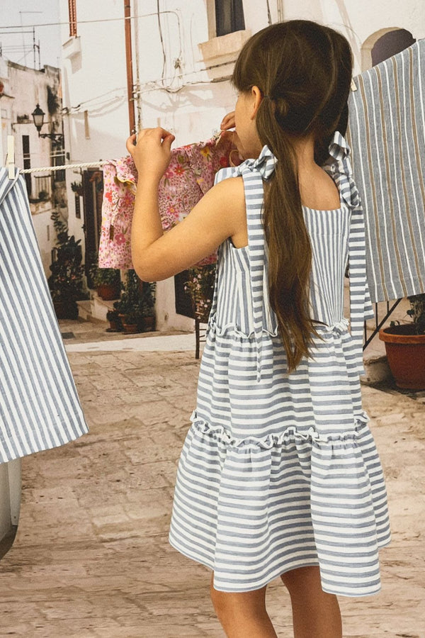 Discover the perfect summer girl dress for your little girl. With an adjustable design, it combines style and comfort for all-day wear. The classic blue and white stripe pattern is ideal for summer days and holidays. Our girl summer dress is made to adapt to growth spurts, ensuring a lasting fit. Prepare for the sunny season with our kids summer clothing, emphasising fun and versatility. Whether at the beach or a family picnic, this dress is the perfect choice for any occasion. Check our or kids summer clothing collection and be ready for season.