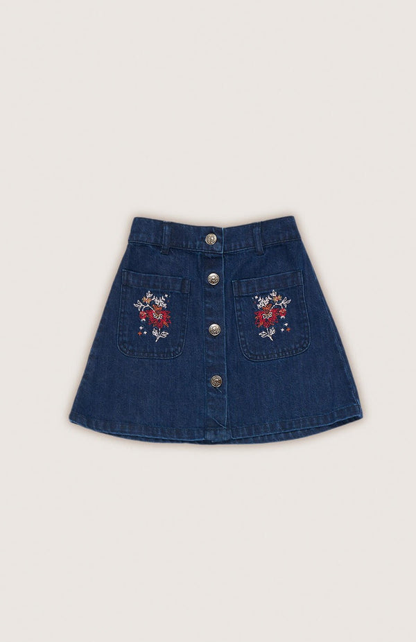Girl's denim skirts for all the stylish girls are here. These girl's denim skirts in space blue are lightweight and perfect for hotter climates- made with 100% BCI cotton. Girl's denim skirts have elastic waists above the knee, metal buttons in the front and two pockets at the front with the most stunning embroidery - we are keeping you stylish and comfortable. Made in Portugal by The New Society. You can buy this season's best and most stylish girl's denim skirt online at MiliMilu in Hong Kong and Singapore.