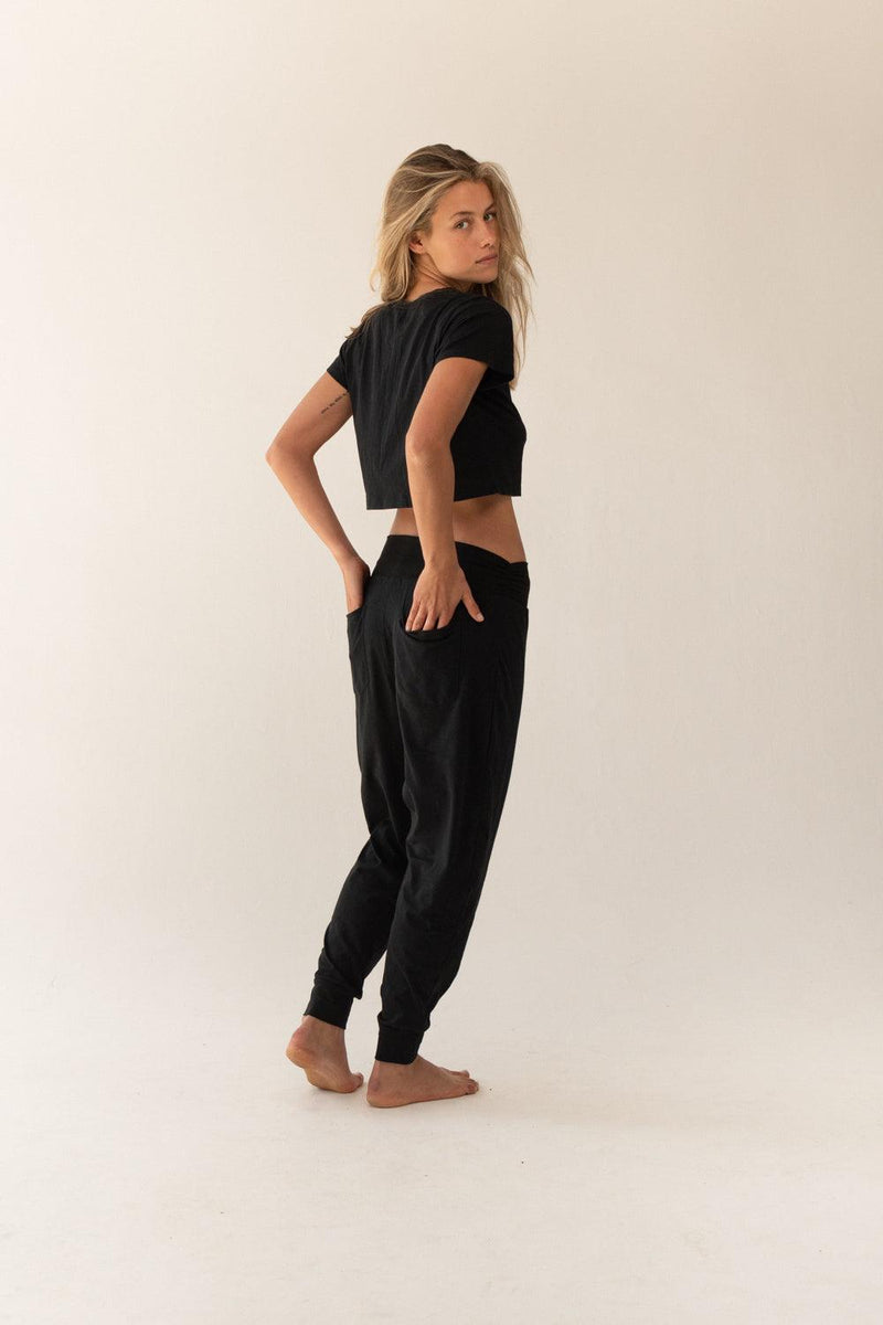 Comfy Buddha pants with a drop crotch and slim fit waistline all in an organic breathable fabric