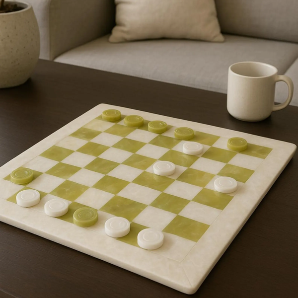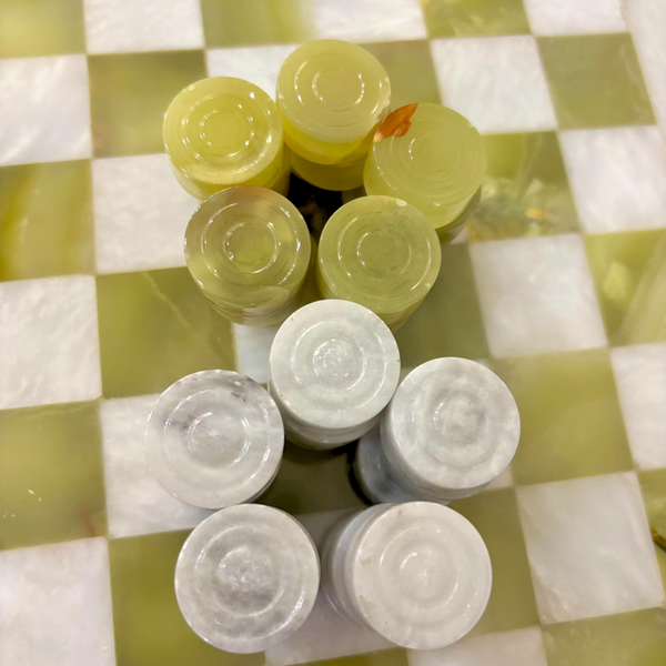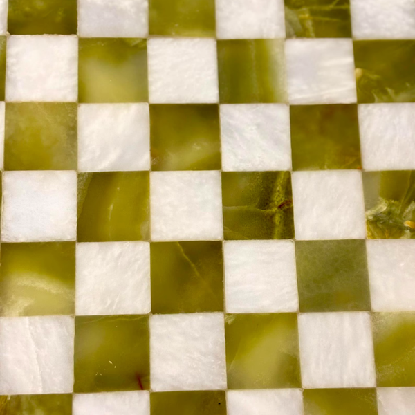 Bring a classic game to the coffee table—elevated in real stone. This Green Onyx Checker Set features a hand-polished board with rich green onyx squares contrasted by creamy white marble inlay. Every piece has natural veining, so no two sets look exactly alike.