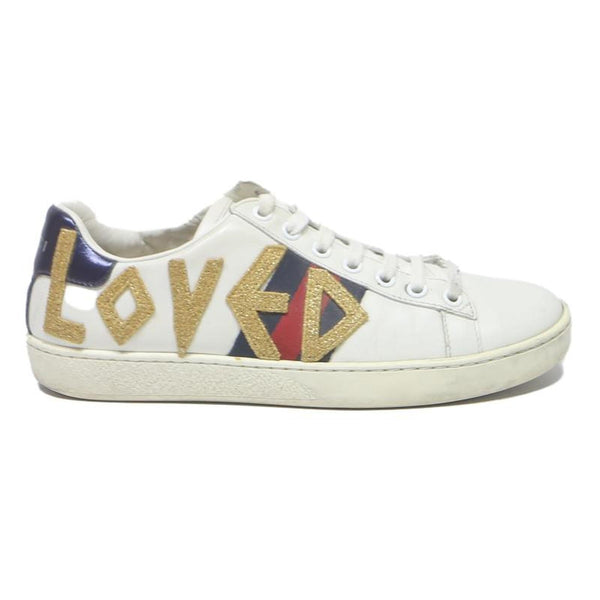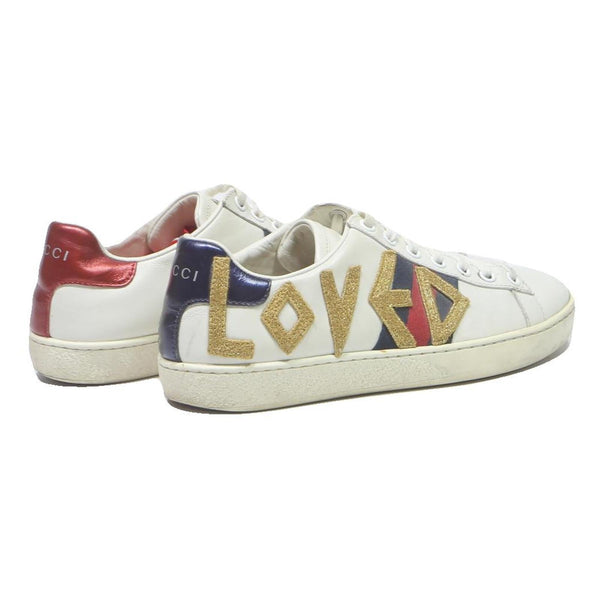These Womens Gucci Ace Trainers showcase a classic low-top silhouette crafted from premium white leather. Both sides feature the iconic green and red Gucci web stripes, highlighted with bold gold glitter letters spelling 'LOVED' for a striking detail. The heel tabs contrast in metallic purple on one shoe and metallic red on the other, each embossed with the brand name.