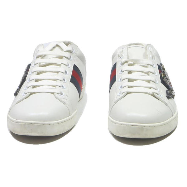 Made from durable synthetic material, these low-top trainers offer a comfortable fit and a sleek silhouette, suitable for casual wear or adding luxe detail to streetwear outfits. The soles and overall structure suggest a moderate level of wear, consistent with fair pre-loved condition. The Gucci Ace line is celebrated for combining distinctive branding with high-quality materials and craftsmanship.