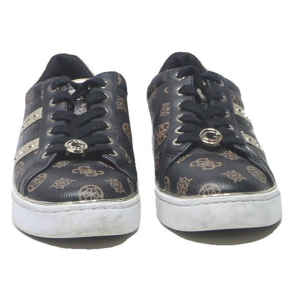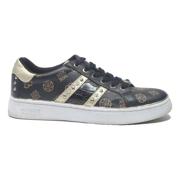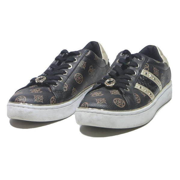Guess logo print womens lace up trainers black & gold leather uk 5 stylish