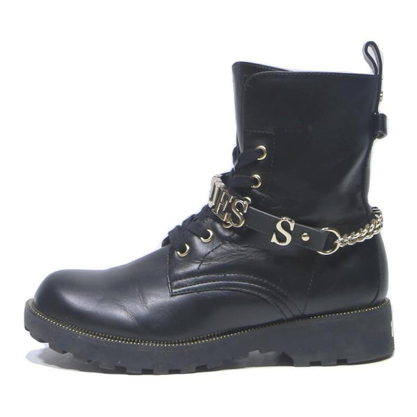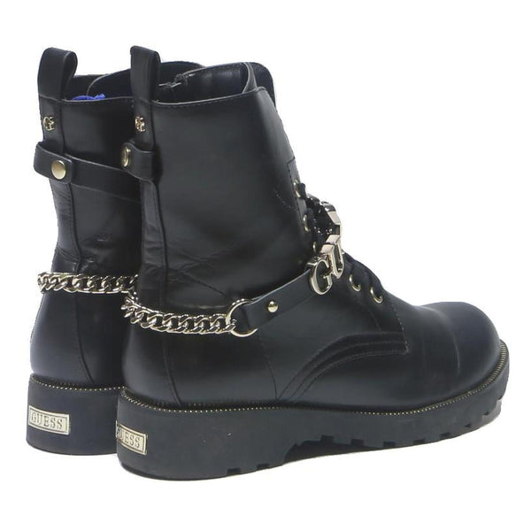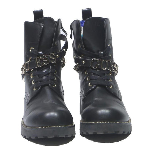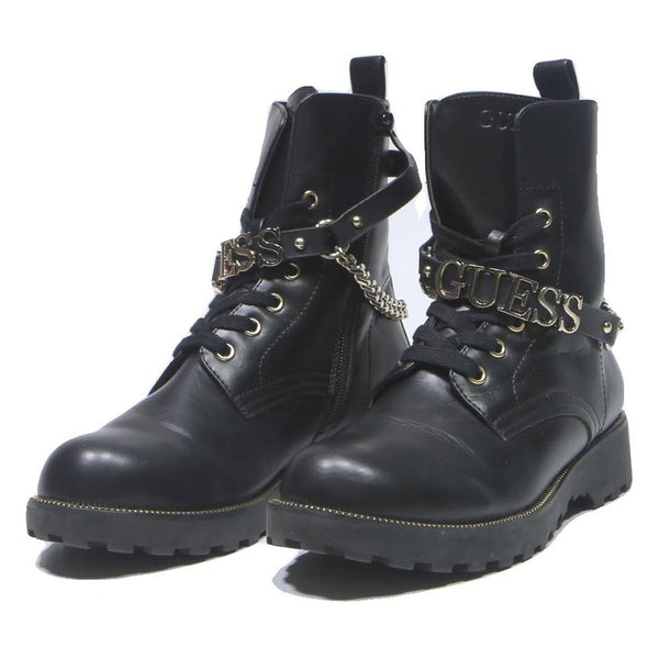 These GUESS womens combat boots are crafted from smooth black leather, lending a sleek yet edgy appearance. The boots feature a classic lace-up design with gold-tone eyelets and a striking metallic GUESS logo detail across the front strap, complemented by a decorative gold chain at the heel. The chunky black sole provides solid traction and adds a bold, contemporary edge to the overall style.