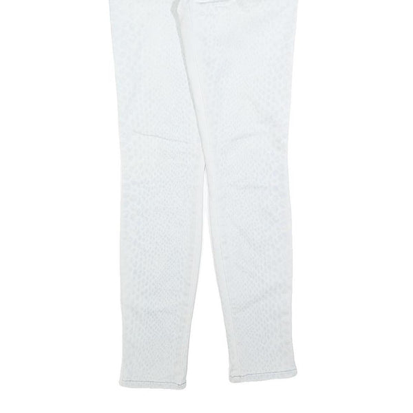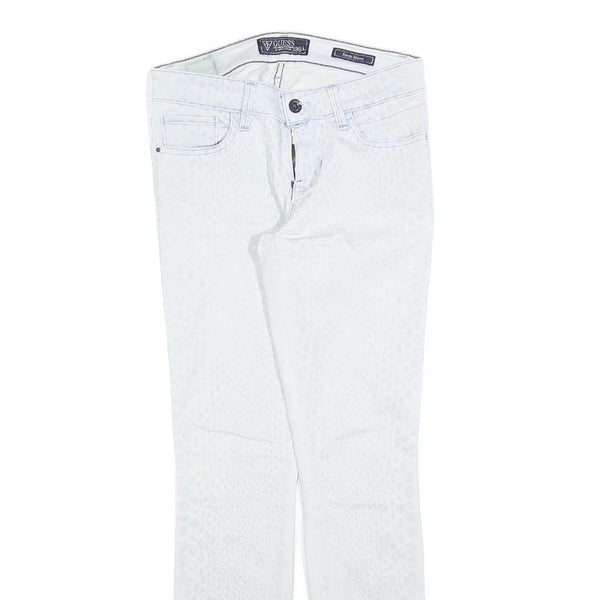 These womens GUESS jeans feature a clean white colour with a subtle tonal animal print pattern throughout, adding a stylish yet understated texture. The front has classic five-pocket styling with a zip closure and button at the waistband. A small GUESS triangular logo patch is located on the back right pocket, actualising brand recognition.