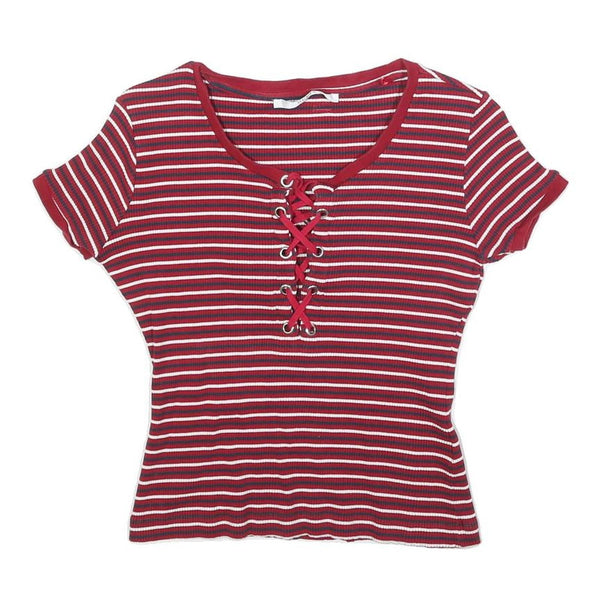 This GUESS womens T-shirt features a vibrant red base with horizontal white and black stripes throughout, presenting a classic yet eye-catching striped pattern. The front includes a stylish lace-up detail with silver grommets that adds a unique graphic element to the piece. The neckline is a flattering scoop style, complemented by short sleeves with subtle rolled hems.