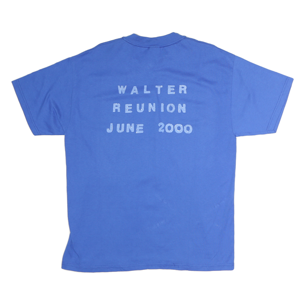 This Hanes mens T-shirt features a vibrant blue colour with a large white graphic on the front showing stylised landmarks inside a circle, branded with "Spokane Wa." The back displays bold white text reading "Walter Reunion June 2000." It is crafted from soft cotton fabric, providing a comfortable and breathable fit ideal for casual wear.