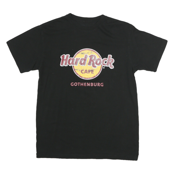 This Hard Rock Cafe men's T-shirt features a classic black base with a distressed Hard Rock Cafe logo printed in yellow and maroon on the front, along with the location name "Gothenburg" below it. The logo adds vintage appeal and a recognizable branded style.
