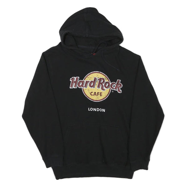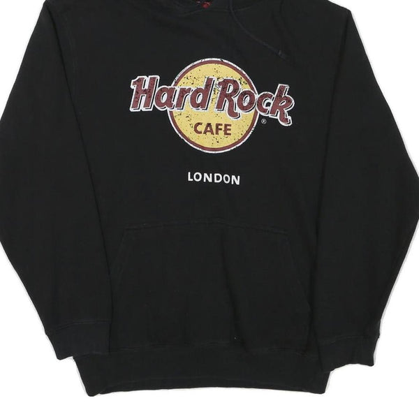 This Hard Rock Cafe hoodie is a classic black pullover featuring the iconic Hard Rock Cafe logo printed across the chest, with "London" beneath it. The colours in the print include shades of yellow and deep red, lending a vintage distressed look that complements the casual style.