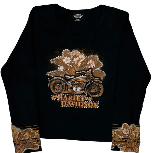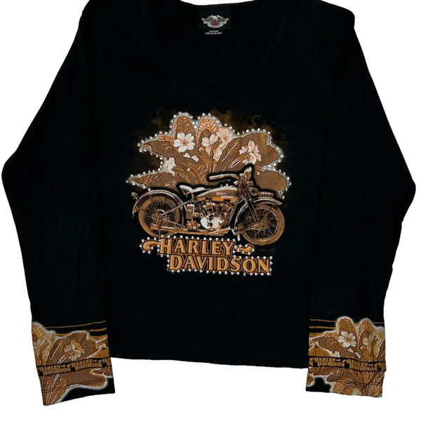 Harley Davidson Graphic Long Sleeve T-Shirt With Floral Details On Cuffs