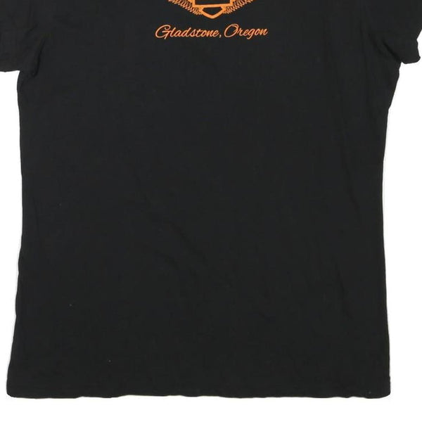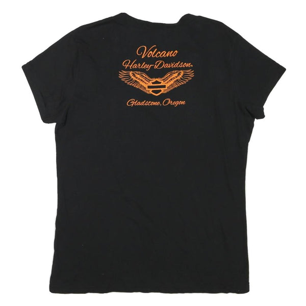 This womens black Harley Davidson T-shirt features a small "Ride Free" graphic with a skull and surrounding lettering on the front left chest. The rear showcases an orange winged Harley Davidson logo with "Volcano Harley Davidson Gladstone, Oregon" scripted above and below it, adding a bold branded element. The V-neckline and short sleeves provide a comfortable and flattering fit.