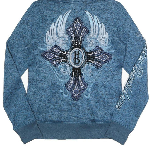 This Harley Davidson womens jacket features a rich blue colour with an intriguing heathered texture throughout. On the front, it is detailed with a striking cross graphic embellished with subtle studs and embroidery, and the same cross motif is boldly printed on the back with decorative wings and swirls. The left sleeve proudly displays "Harley Davidson" in a stylish script.