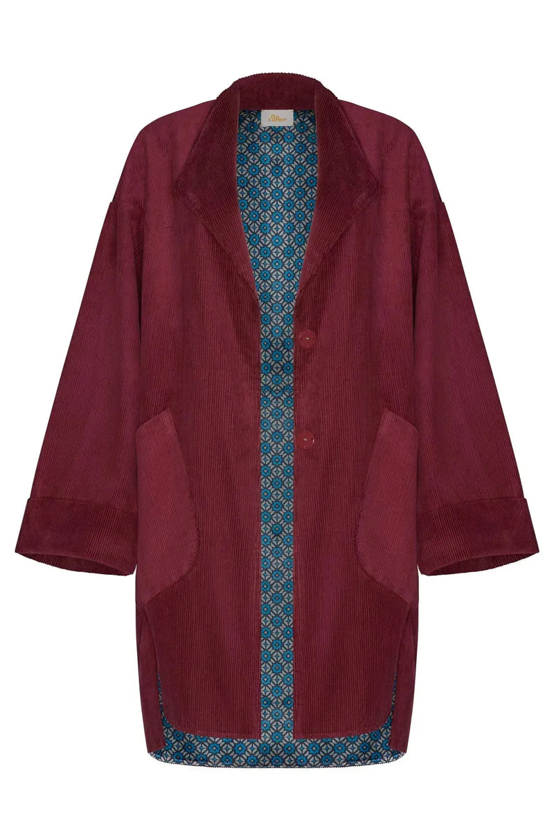 The Hilmar is a long, oversized jacket, falling to the mid-thigh. Oversized features make it iconic: large, patch pockets; side vents; a stepped hemline; and wide, turned-back cuffs. Beautifully lined, this jacket looks easy-going, and feels luxurious.