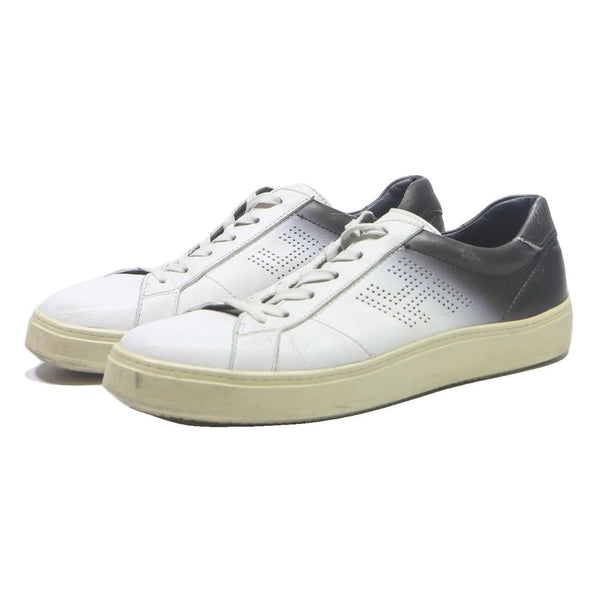 These HOGAN Mens Classic Low Top Trainers feature a sleek and timeless design with a white leather body that smoothly transitions to black around the heel collar. The sides are detailed with the iconic perforated HOGAN 'H' logo, adding subtle yet distinctive branding. They have a low-profile silhouette perfect for casual wear.