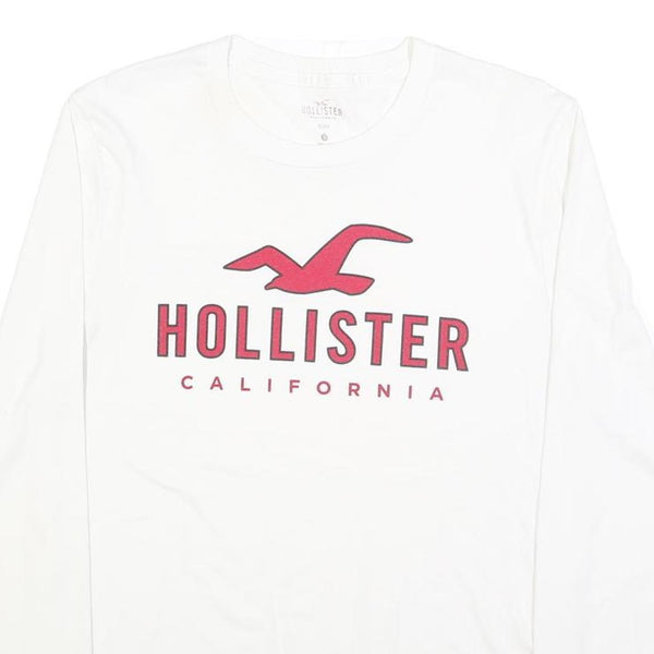 This HOLLISTER mens long sleeve T-shirt is crafted in a soft cotton blend fabric, providing comfortable wear. It features a crisp white base with a bold red graphic of the Hollister bird logo and brand name "HOLLISTER CALIFORNIA" prominently displayed across the chest.