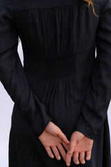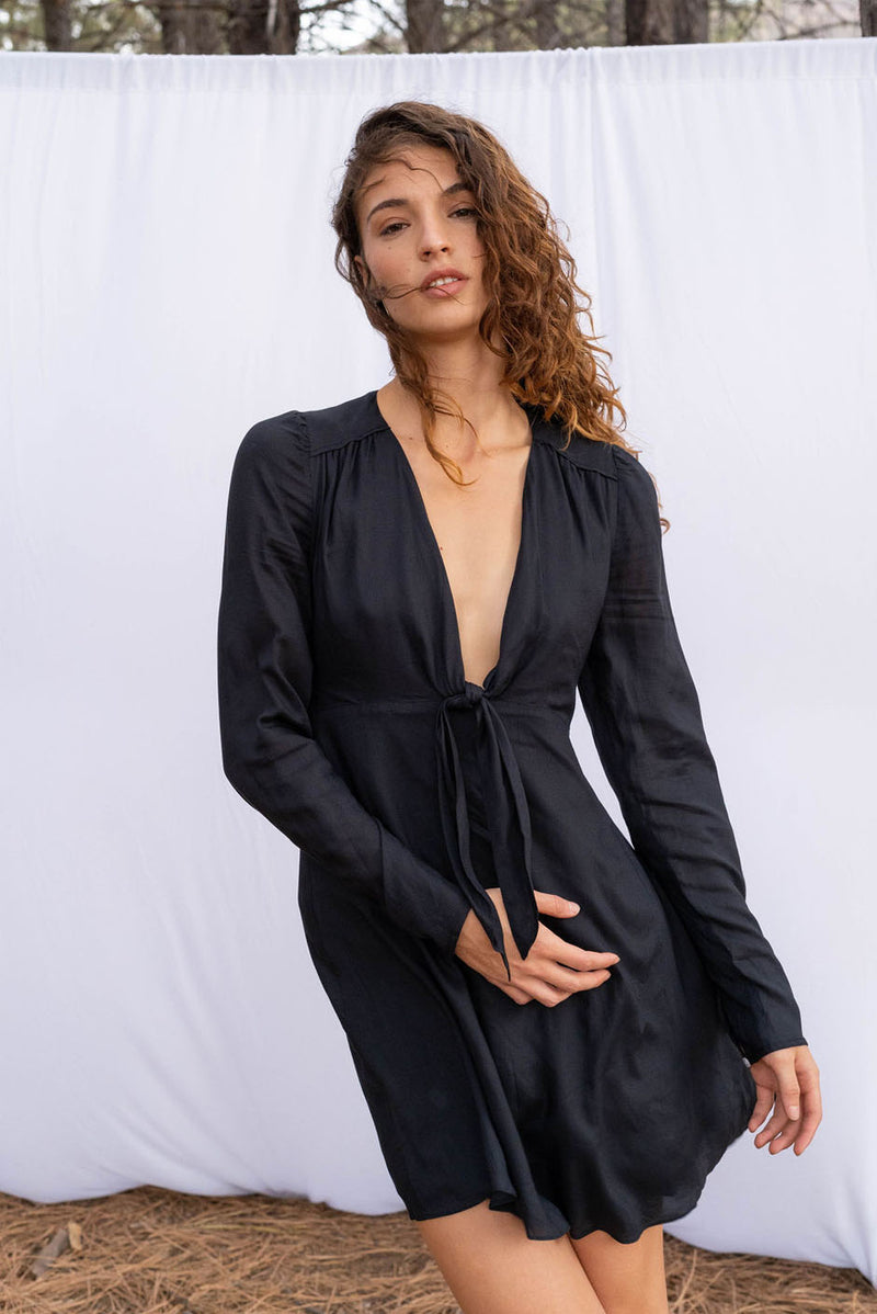 Chic and sleek, this luxurious fit and flare little black dress is perfect for any night out. The tie front neckline creates a flattering shape for any occasion. Holly's silky soft fabric and smocked back make this the ultimate comfortable and chic party dress. Perfect for dressing up or down.