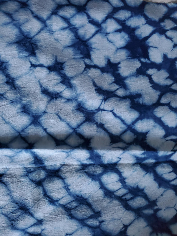 This textile design uses a mixed resist and gathers hand technique that is time-intensive and requires skill and attention to detail
