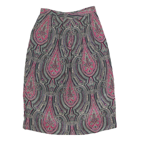 This J.G HOOK womens skirt features a striking paisley pattern in pink, purple, and green tones. The intricate paisley design covers the full skirt, giving it a lively and elegant appearance. It has a mid-length cut that offers a flattering fit suitable for various occasions.