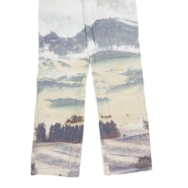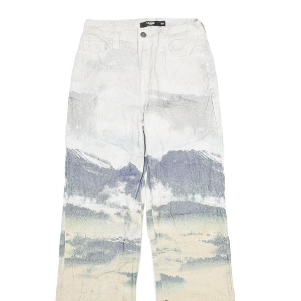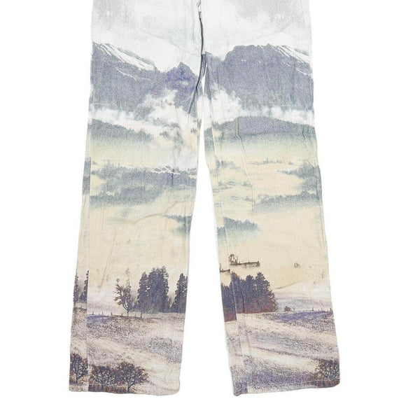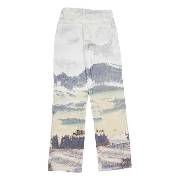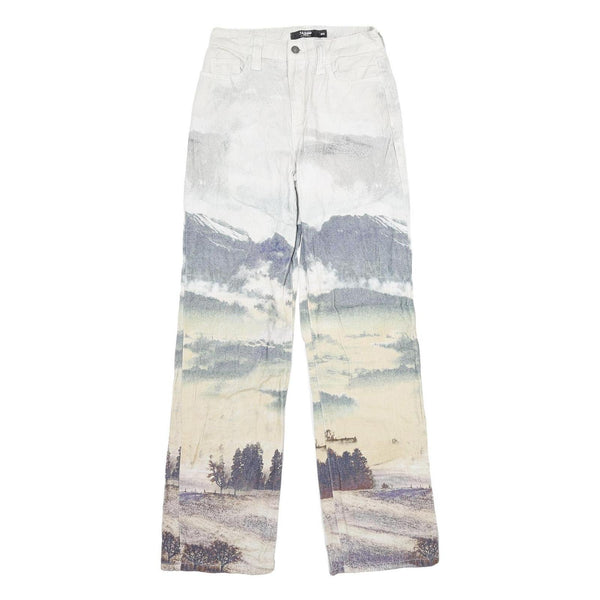 These JADED LONDON womens jeans feature a striking landscape print across a primarily white and blue palette. The detailed scenic design includes mountain peaks, cloudy skies, and forested areas creating a unique and artistic look on the legs.