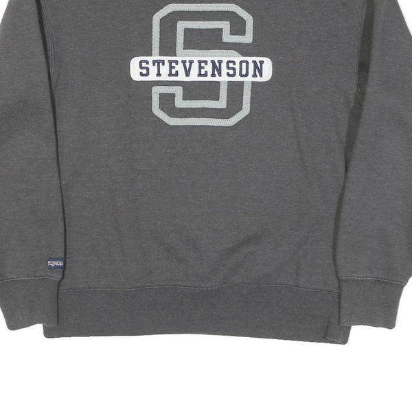 This Mens JANSPORT sweatshirt comes in a solid grey colour featuring a large stitched applique on the front centre spelling "STEVENSON" across a large collegiate-style letter "S". The design is classic collegiate, giving the sweatshirt a vintage sporty aesthetic.