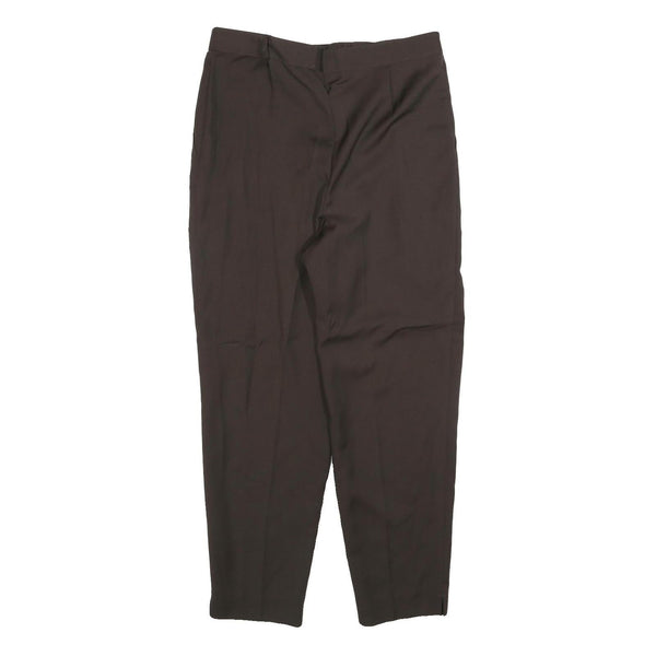 The trousers have a zip closure at the front, complemented by buttons at the waistband for secure fastening. The design includes subtle pleats at the front that add to the tailored appearance. These smart trousers provide a refined finish for professional or dressy occasions.