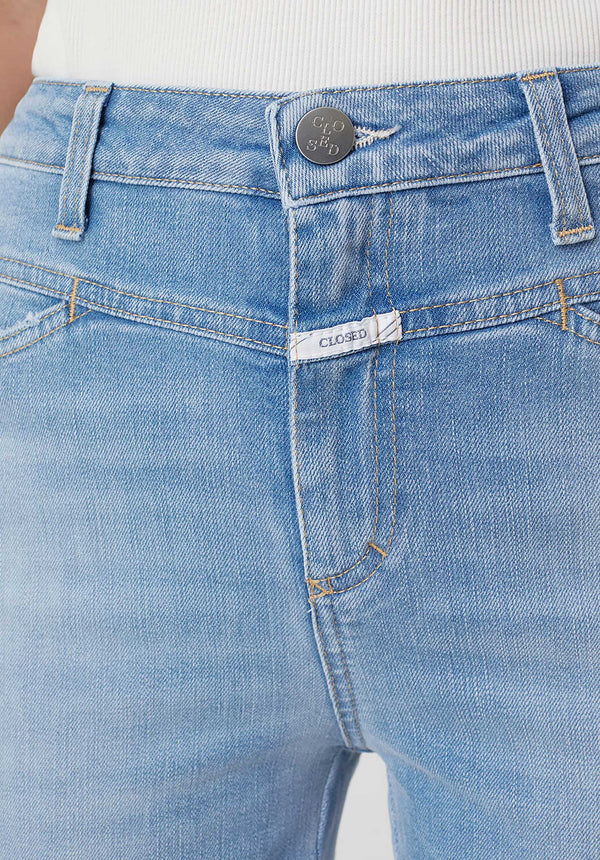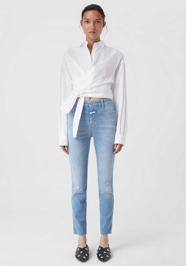 – Looks like: bright wash with destroyed effects and fringed hem