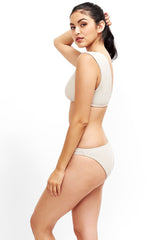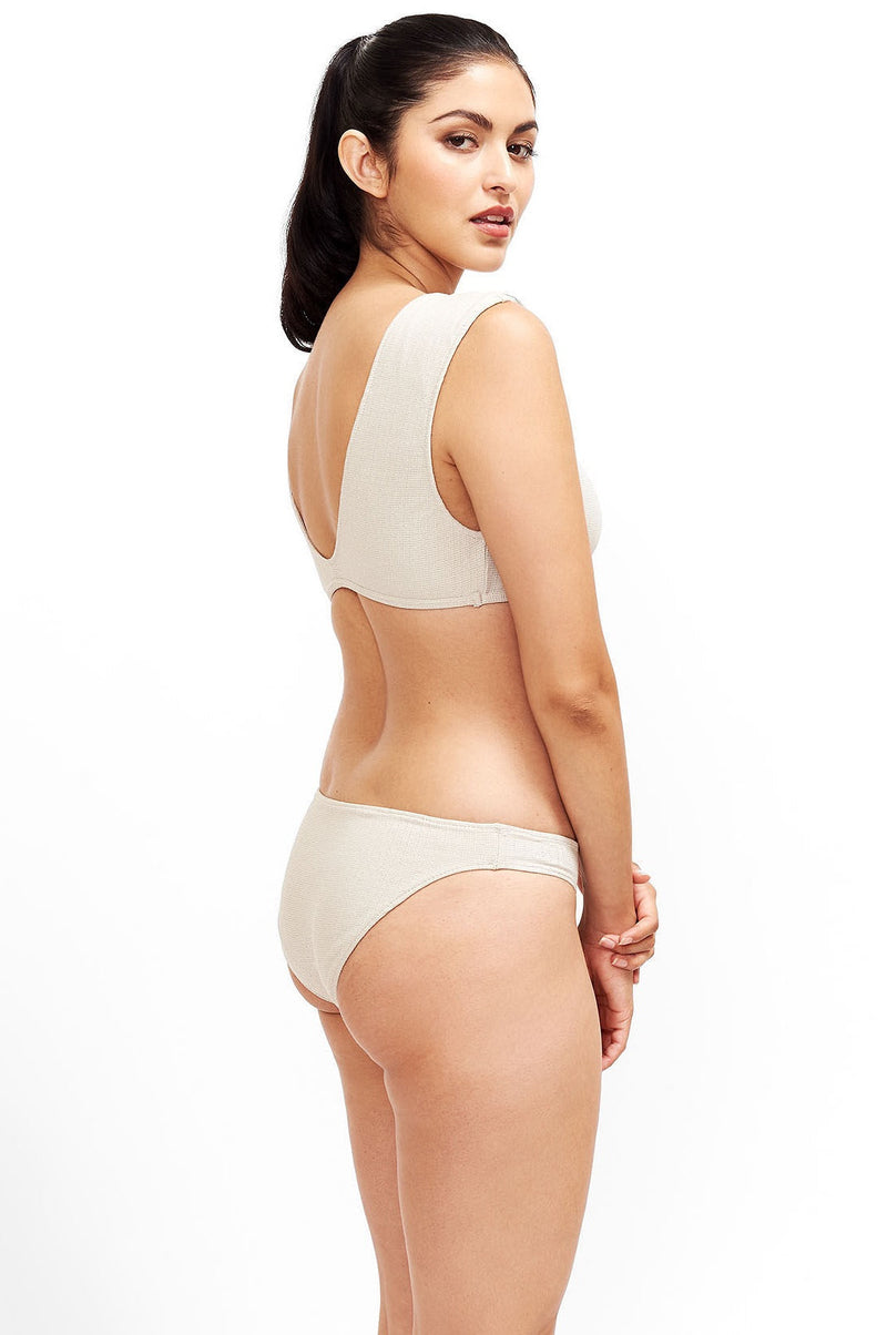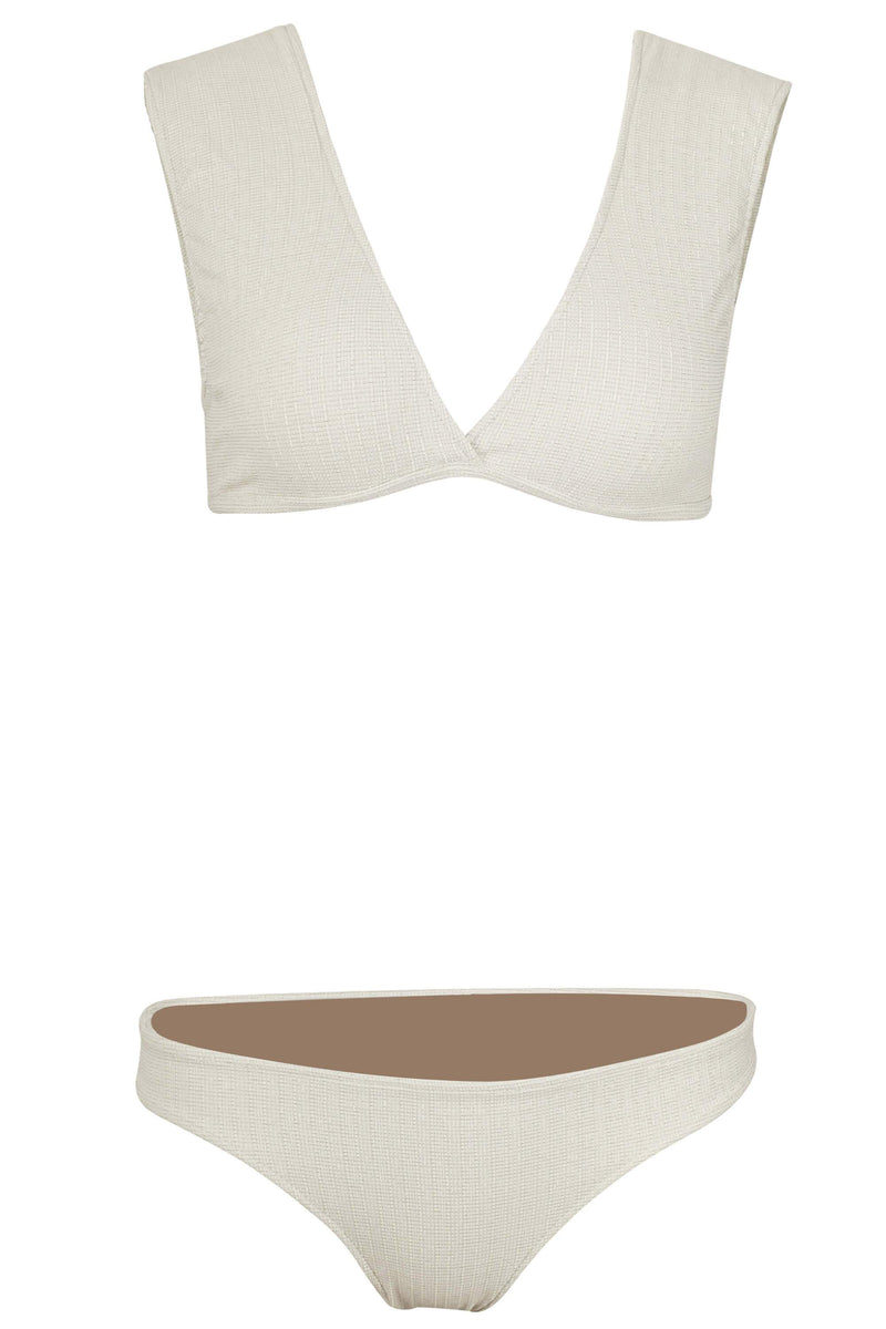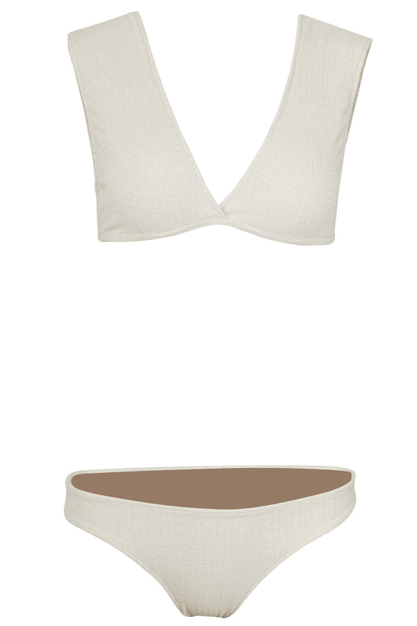 The Jenna bikini top is a classic yet trendy piece. The V neck cut is very comfortable and offers moderate coverage. And YES! you can get in the water in it! The Jenna top comes in this sophisticated platinum print that is suitable for water fun. Jenna doubles as a crop top with shorts, skirt or pants!
