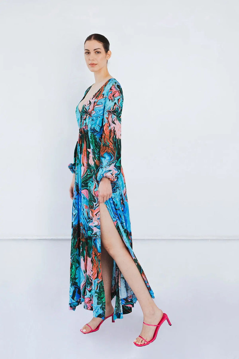A stunning Printed maxi dress from our Second Layer Collection! Focusing on our core values, this piece is sustainable as it is stylish. The multicolored paint swirls are inspired by artistic notions of layering paint over an existing painting on a canvas.