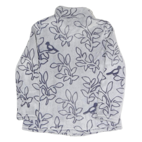 This Julietta Collection womens jacket features a soft grey base with a delicate navy botanical print accented by subtle bird motifs. The full front zip closure provides easy wear, complemented by a high neck collar for added warmth. Crafted from a comfortable polyester blend fabric, this jacket offers a plush feel and cosy fit suitable for casual daily wear.