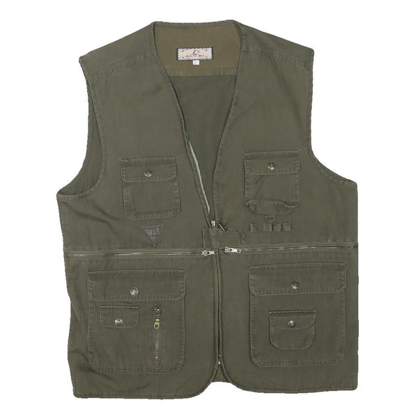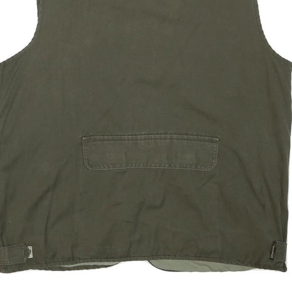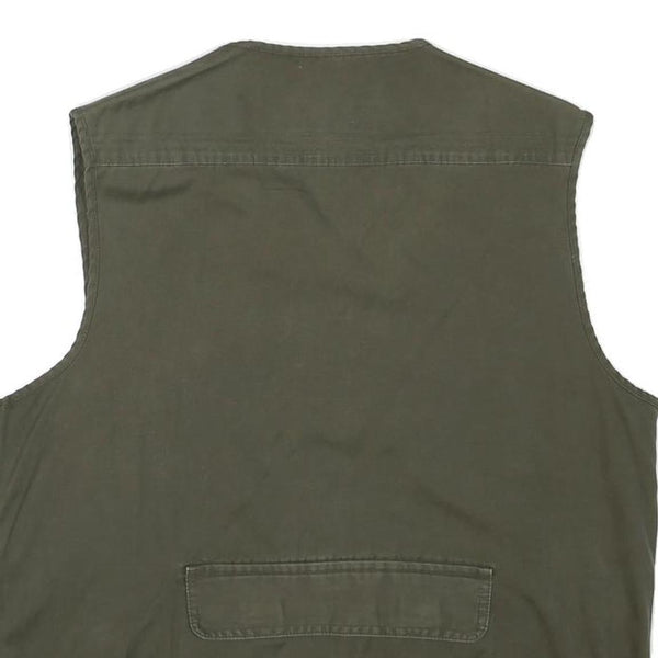 Constructed with a straight cut fit and sleeveless design, this jacket offers a versatile layering option for casual and outdoor wear. The rear has a single large pocket with a flap, enhancing its utilitarian aesthetic. The cotton blend fabric provides a soft feel with subtle texture, suitable for comfortable everyday use.