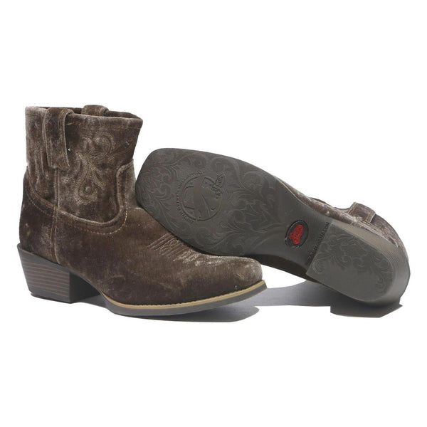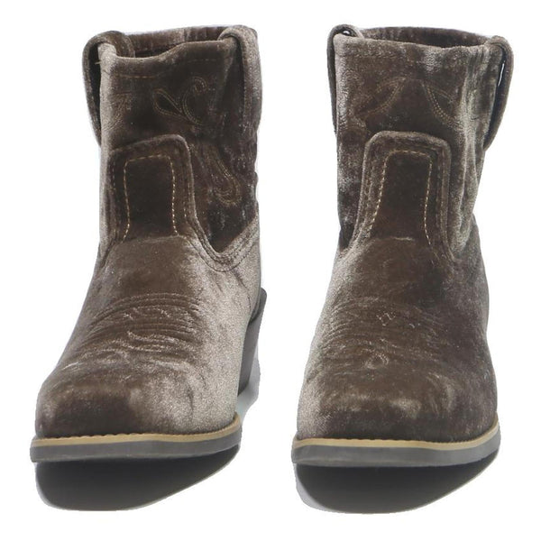 These womens ankle boots by Justin come in a rich brown synthetic material with a velvety texture. They feature intricate tonal embroidery along the shaft and over the toe area, lending a western-inspired style. The rounded toe and pull tabs on each side add practical detail.