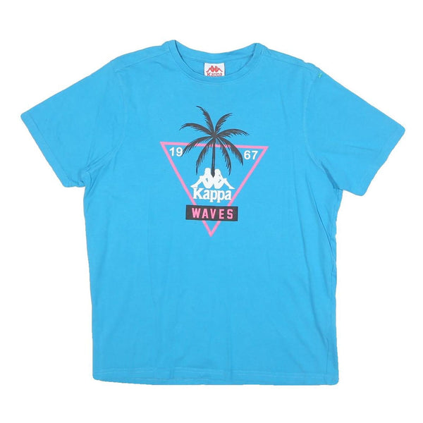This mens KAPPA T-shirt features a vibrant blue colour with a front graphic print showcasing a palm tree inside a pink triangle outline, the brand name and year 1967, and the word WAVES beneath in pink on a black background. The back has a smaller WAVES print in similar colours near the top. Made from a soft cotton blend, this tee offers a comfortable and breathable wear ideal for casual or sporty looks.